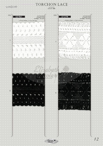 TORCHON LACE 30c Stretch 彈性 COTTON 90% COTTON 90% LS 961 SPANDEX 10% LT 274 SPANDEX 10% UNIT包裝:30Y/Roll UNIT包裝:30Y/Roll 75mm Width / 2 Color Samples 80mm Width / 2 Color Samples 1 1 9 9 12